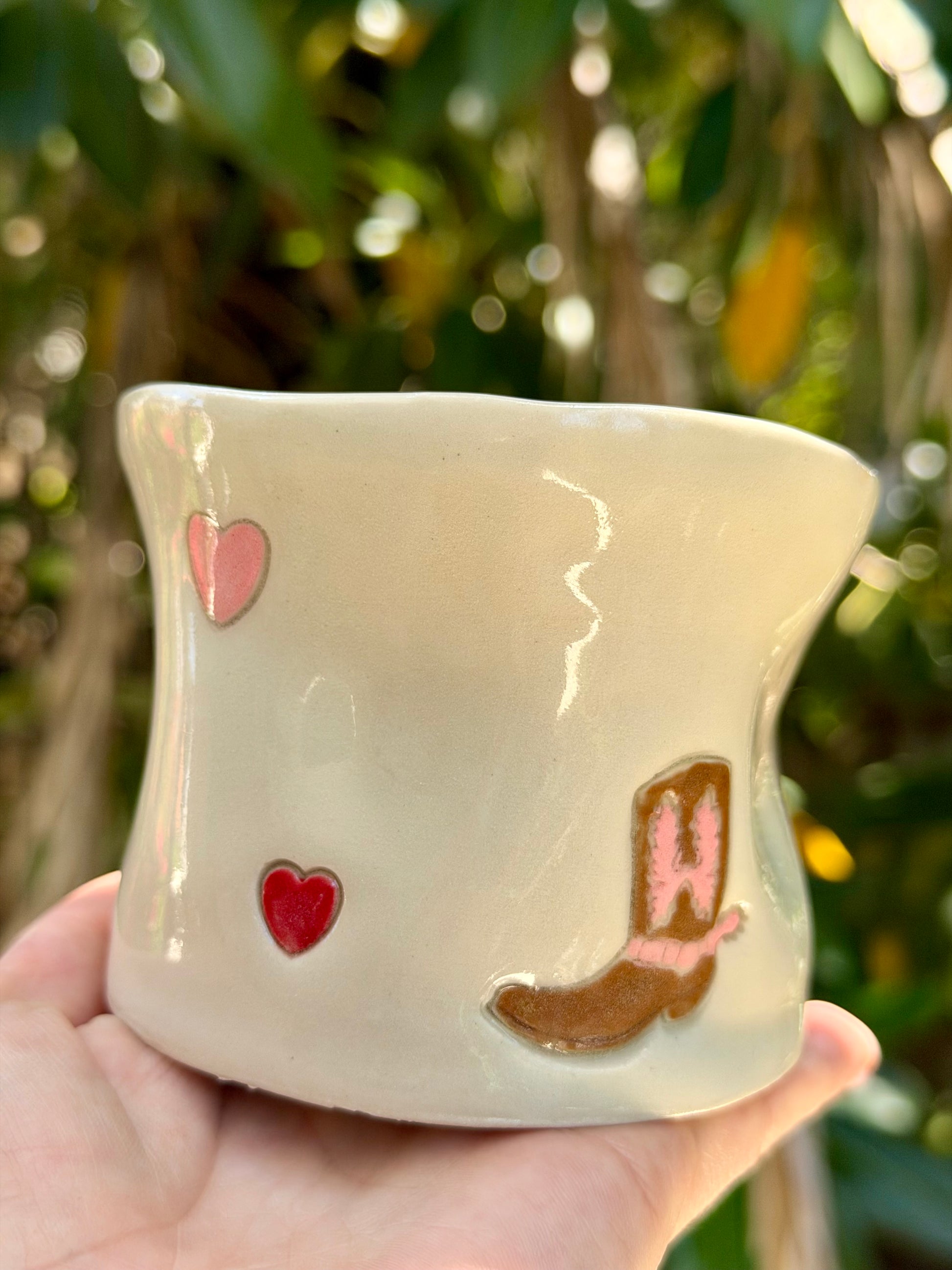 Hand-painted with brown and pink cowboy boots, finished with pink and red love hearts, each mug has its own small variations that make every piece unique. It’s a fun, feel-good design - perfect as a gift or a cheerful addition to your own mug collection.